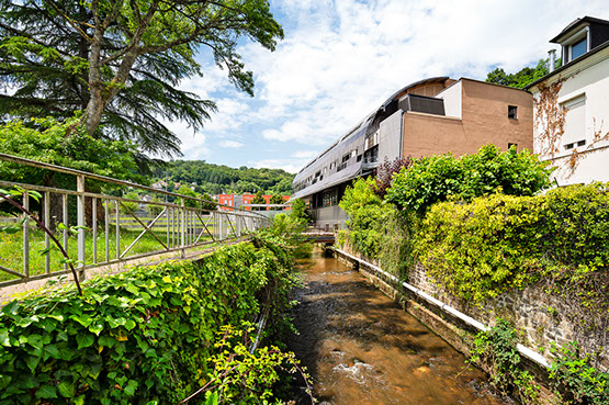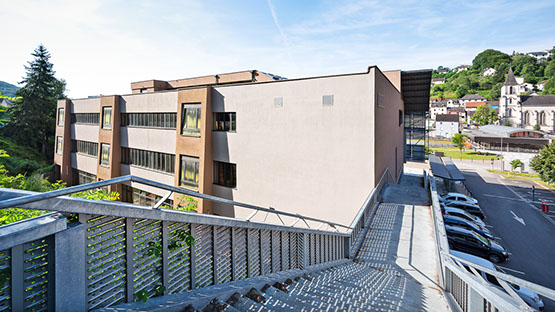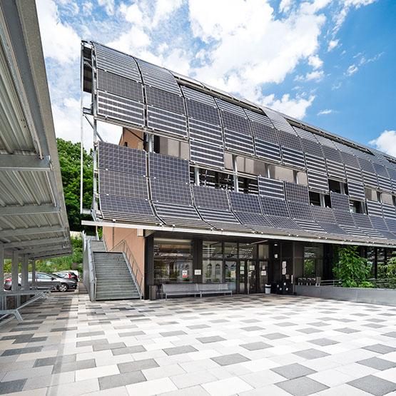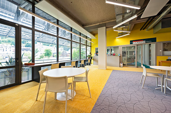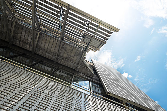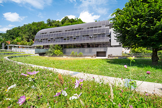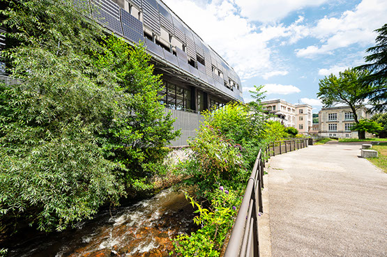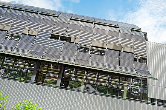La courbe enveloppante intérieure se projette en extérieur avec une sur-toiture et une double façade recevant des panneaux photovoltaïques, selon un système innovant d'autoconsommation collective de 195 kVA.