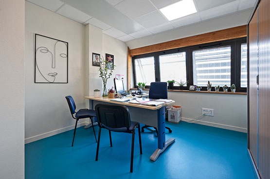 Le chauffage et le rafraichissement sont assurés par 15 forages géothermiques de 200 m vers 2 pompes à chaleur alimentant des plafonds rayonnants.