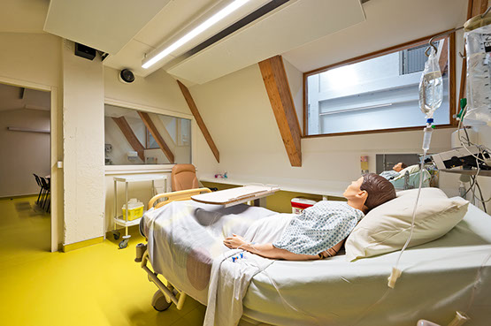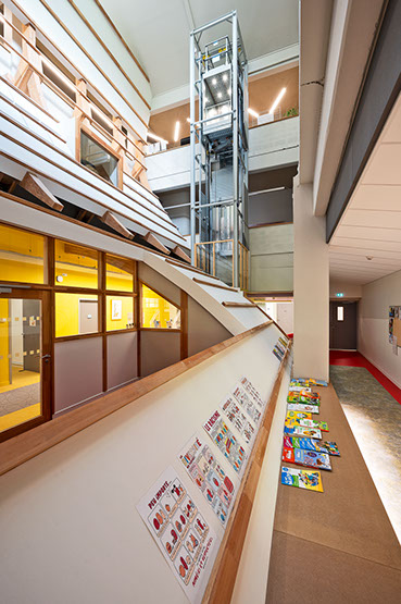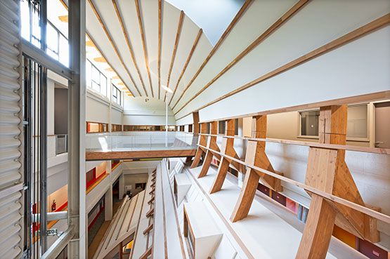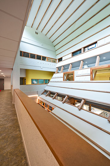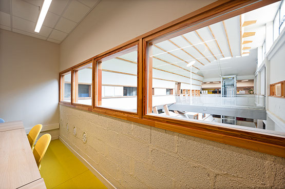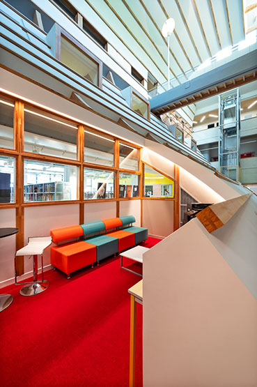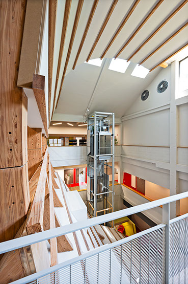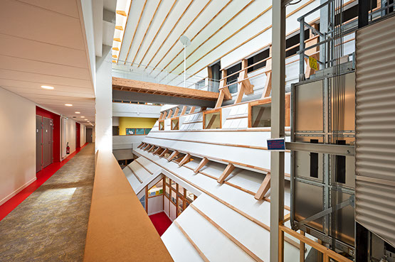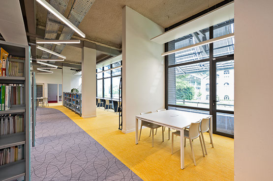 Pour le transformer en pôle universitaire, l'énorme masse a été évidée en son cœur sur 3 niveaux. Cet atrium fait respirer les plateaux par sa lumière douce du Nord. Sa forme très particulière, sans base basse, suggère une ambiance de campus à la fois reposante et déstabilisante, à la fois rigoureuse et gaie. Les 4 entités du programme se côtoient ainsi dans une grande unité respectant leurs identités.