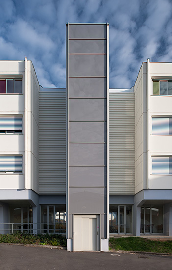 Pour cette restructuration technique de trois bâtiments béton des années 1960 à usage d’internat, nous avons opté pour une mise en valeur de l’architecture originelle : transparence des rez-de-chaussée pour les salles communes, contraste entre les ailes latérales (chambres) et centrales (services). Ainsi, la conception sur pilotis d’origine est amplifiée, de même que la légèreté des étages. La création d’un ascenseur sur le bâtiment central renforce la symétrie et la verticalité des compositions.
