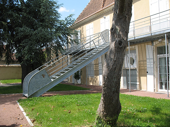 À l’opposé, côté ville, la vieille maison de maître a été redivisée en petits logements grâce à une coursive métallique, et se complète de deux petits bâtiments faisant le lien avec le square triangulaire.