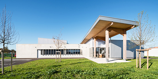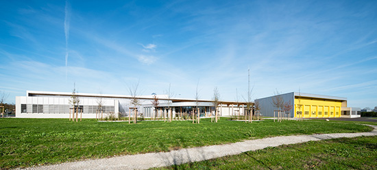 Les bâtiments sont regroupés à l'avant du terrain, le long de l'avenue principale. Ils sont reliés par une galerie de bois marquant les interrelations techniques et fonctionnelles, et formant un signal d'envergure à l'échelle du site.