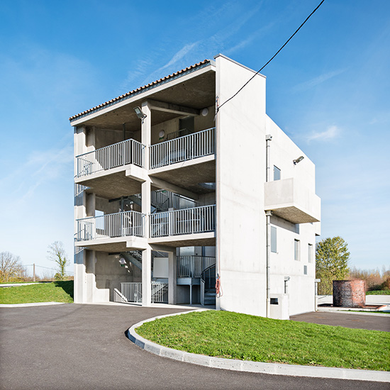 De part et d'autre de cette galerie, chaque bâtiment se déploie selon ses fonctionnalités propres (bureaux, cours, foyers, exercices, remises, ...) avec des écritures très sobres utilisant le béton brut et l'aluminium.