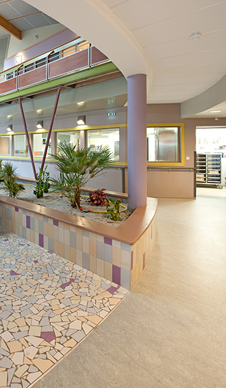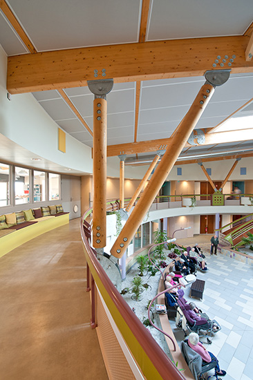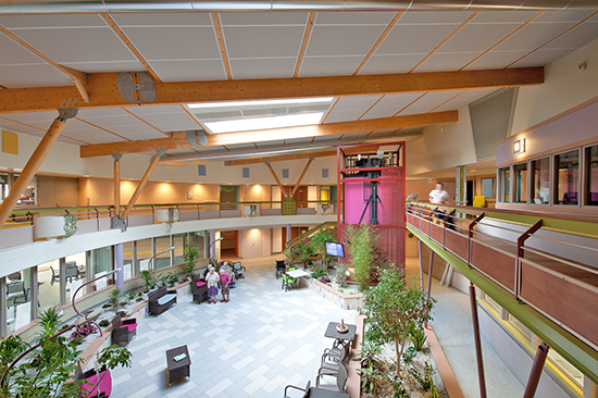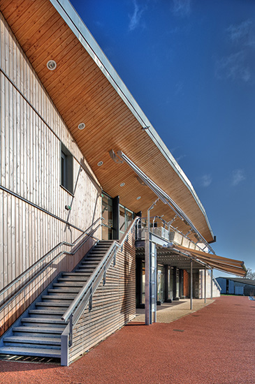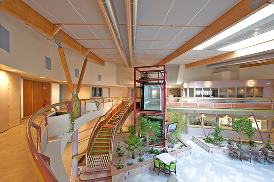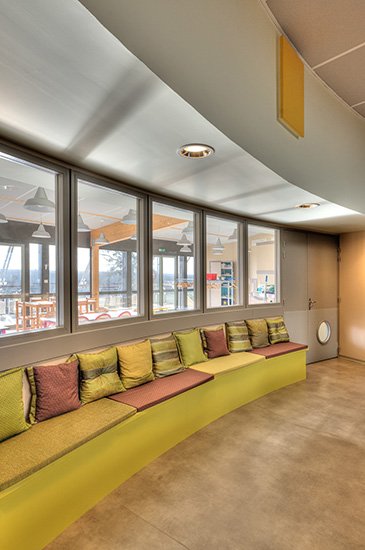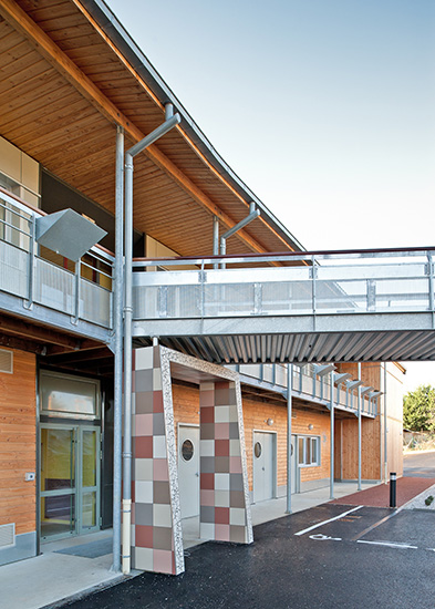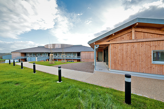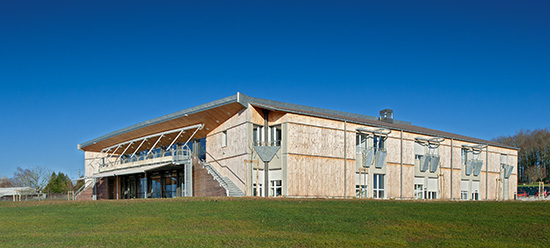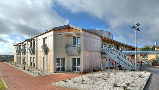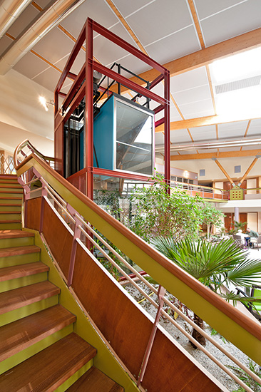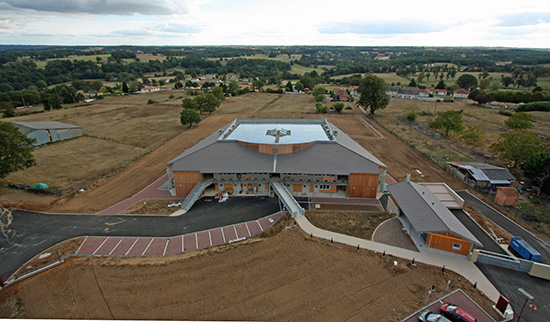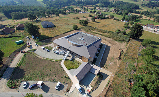 insertion paysagère, ossatures et charpentes bois, e.c.s. solaire, atrium - jardin intérieur, chaufferie bois, production électrique photovoltaïque de 700 m2