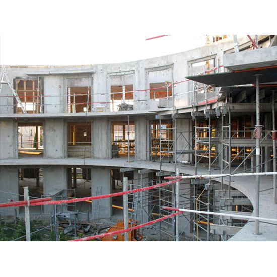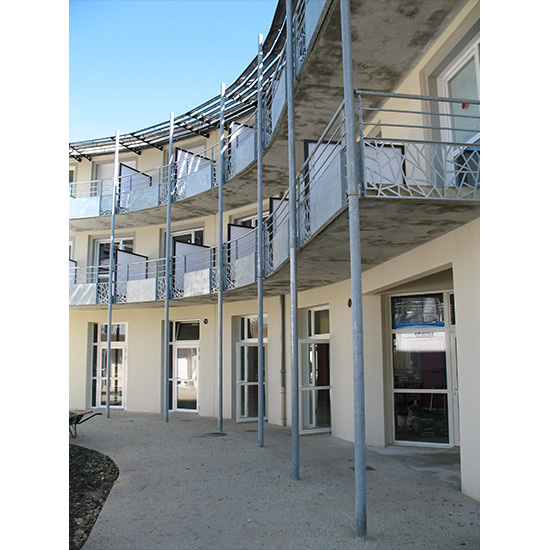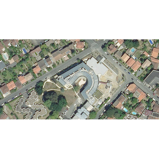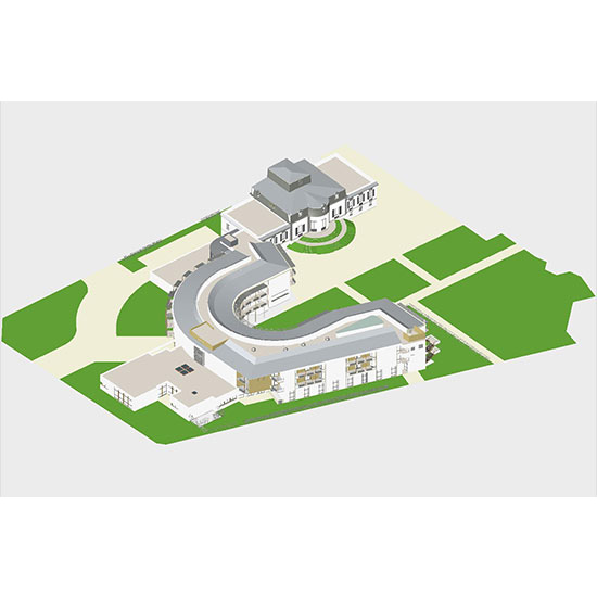 Dans le beau parc du “Château-Gardères”, le nouveau bâtiment formera une rotonde en creux perpendiculaire à lʼaxe du bâtiment historique. Le bâtiment étant conçu en R+2, les résidents bénéficieront de cheminements courts vers le noyau vertical central. Celui-ci débouchera dans un rez-de-chaussée très ouvert sur les jardins, en double face.