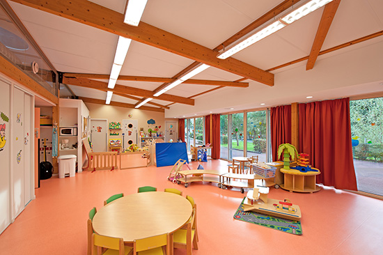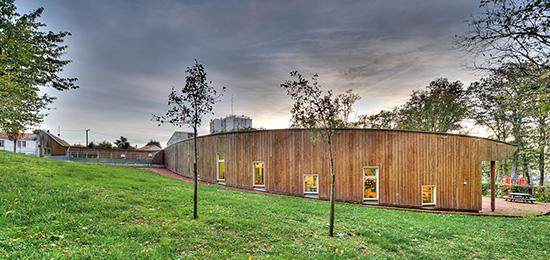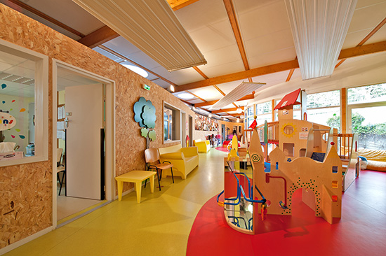 Vu des tours de logements voisines, c’est un piano rayé de rouge et de vert. Vu de l’intérieur, c’est un lieu très particulier où le bois dominant communique sa chaleur aux ambiances colorées pour les tout-petits.