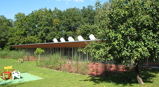 Vu du bas du terrain et du grand parc à jeux, c’est une ligne horizontale pure étirée sur 50 m de longueur, une ombre sous un débord de 2,5 m de laquelle émergent cinq « canons » à lumière.