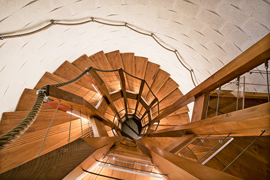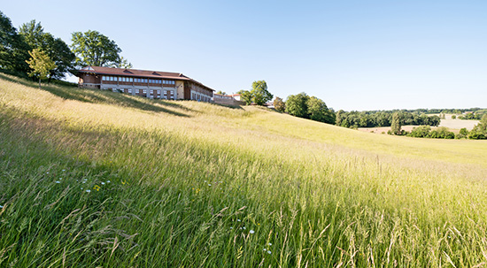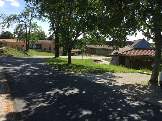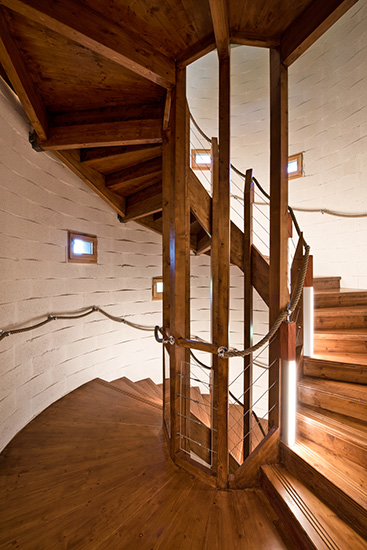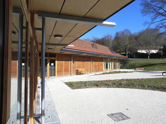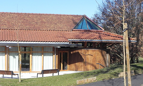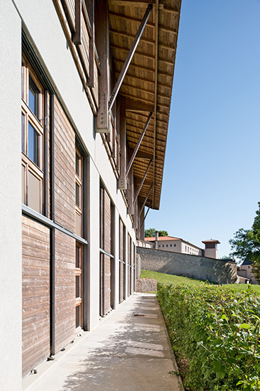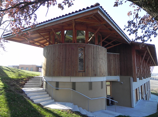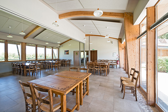 Sur un socle de béton ancré dans la pente où les chambres ouvrent sur le paysage, le niveau supérieur entièrement en bois accueille toutes les activités communes: repas, réunions, bibliothèque. L'oratoire circulaire, en proue du bâtiment, est un signal d'accueil aux visiteurs. Le toit mixte en tuiles plates et courbes réinterprète l'architecture locale.