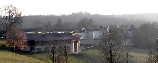 La nouvelle hôtellerie vient s'accrocher au fort relief face à l'entrée de l'abbaye, avec un contraste d'écriture mettant en valeur les "cubes" d'accueil créés dans les années 2000 par Dominique Lescane.