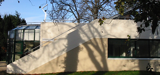 Les toits terrasses de ces extensions sont accessibles : l’une végétale, l’autre minérale.
