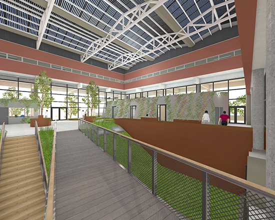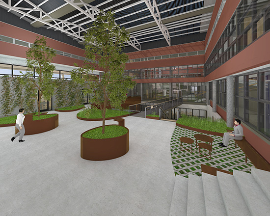 la rénovation thermique dans le cadre du décret tertiaire (-60% de consommation) intégrant un raccordement au réseau de chaleur urbain et une grande surtoiture photovoltaïque, et une transformation des cours et vides en atriums.