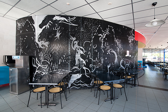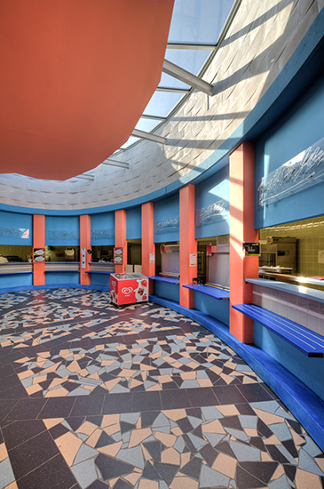 Cette dichotomie trouve son articulation dans l’ « œuf de distribution » qui, au cœur du bâtiment, mélange systèmes de self et de postes à thèmes pour une rencontre conviviale entre étudiants et personnels.