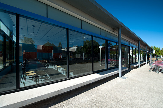 Son bardage et ses détails métalliques le montrent comme un objet fonctionnel et technique (une grande cuisine collective), tandis que sa grande façade vitrée ouverte sur la rue affirme sa vocation publique.