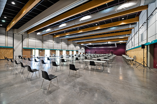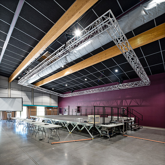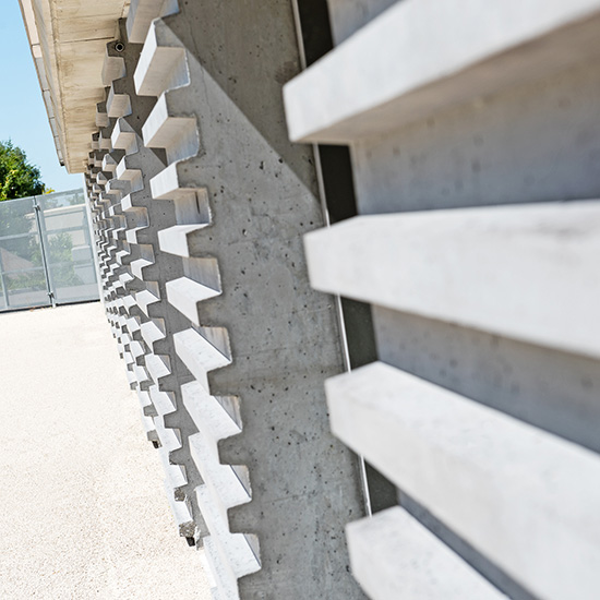 En contrepoint, la légèreté d'une toile tendue signalera le nouveau Lunesse de très loin, y compris la nuit par sa mise en lumière. Cette toile formera un auvent ample et efficace tout en permettant une ventilation ascendante intéressante par forte chaleur. Cette technique éprouvée et pérenne forme un tout avec les "falaises" auxquelles la toile s'arrime. Elle sera un point de repère immanquable entre le lycée et le supermarché.