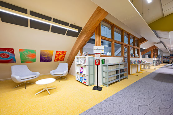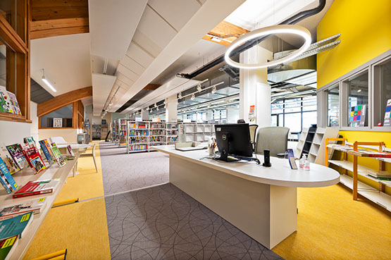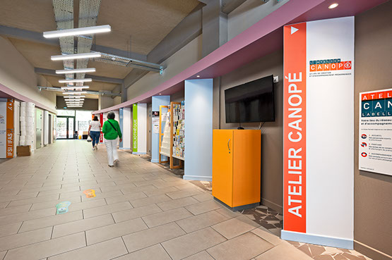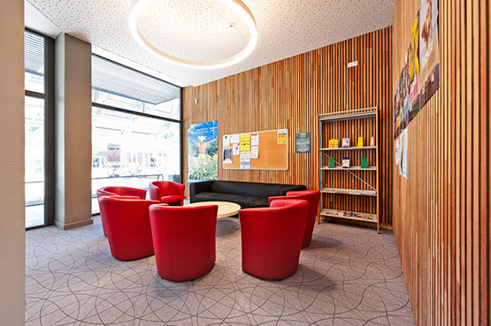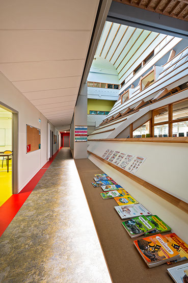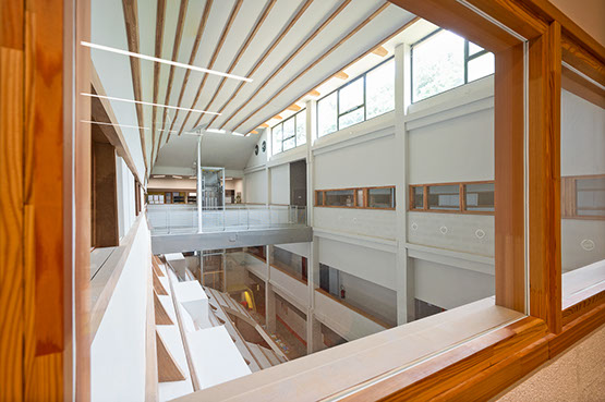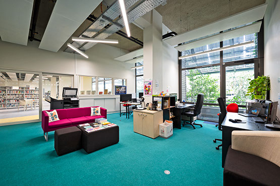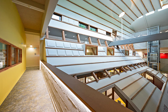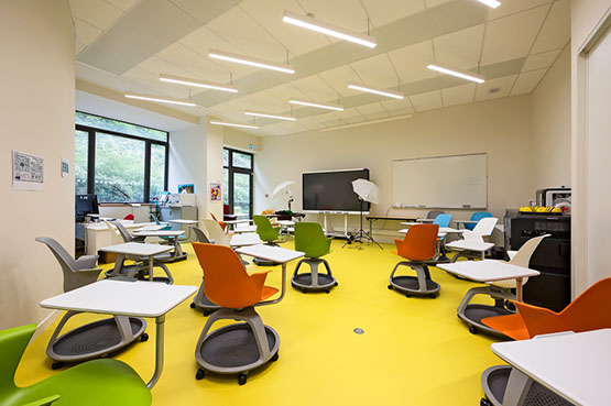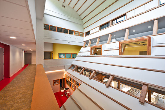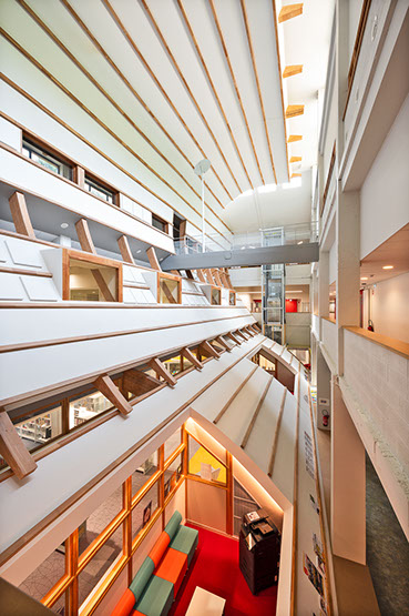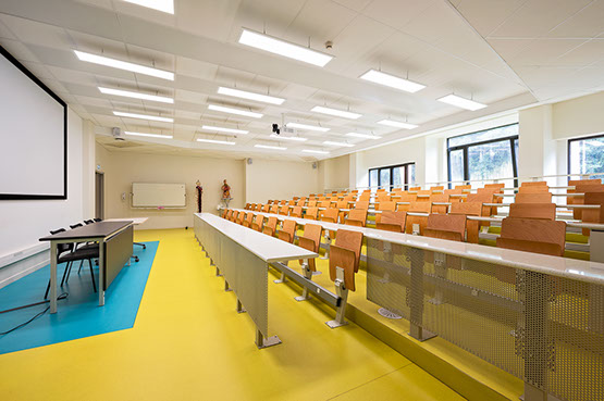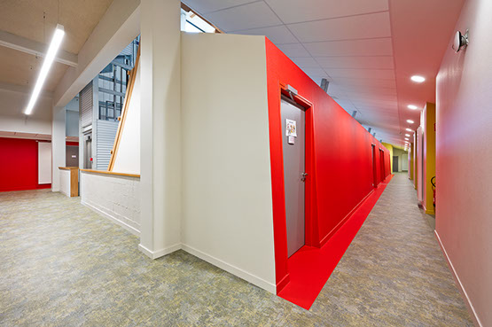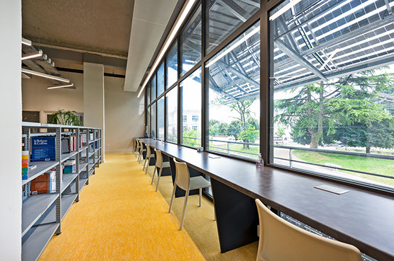 Pour le transformer en pôle universitaire, l'énorme masse a été évidée en son cœur sur 3 niveaux. Cet atrium fait respirer les plateaux par sa lumière douce du Nord. Sa forme très particulière, sans base basse, suggère une ambiance de campus à la fois reposante et déstabilisante, à la fois rigoureuse et gaie. Les 4 entités du programme se côtoient ainsi dans une grande unité respectant leurs identités.