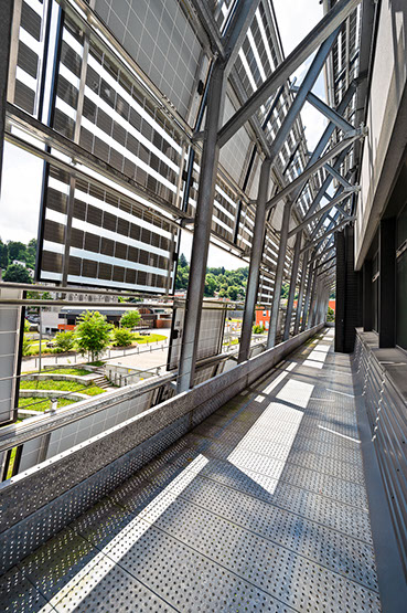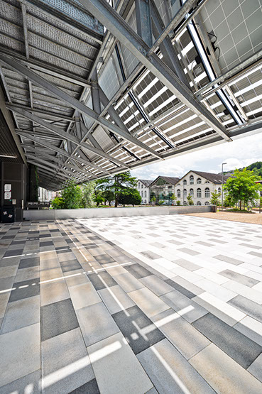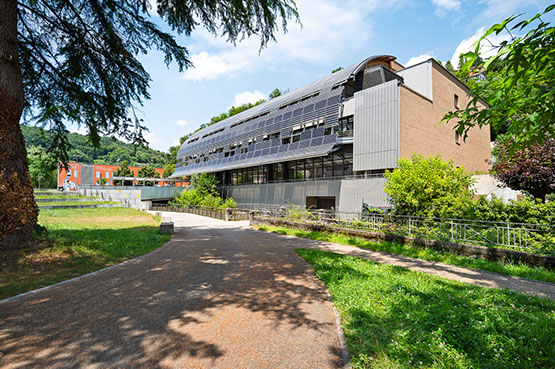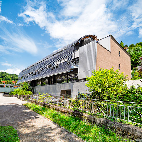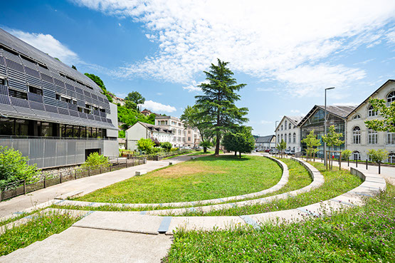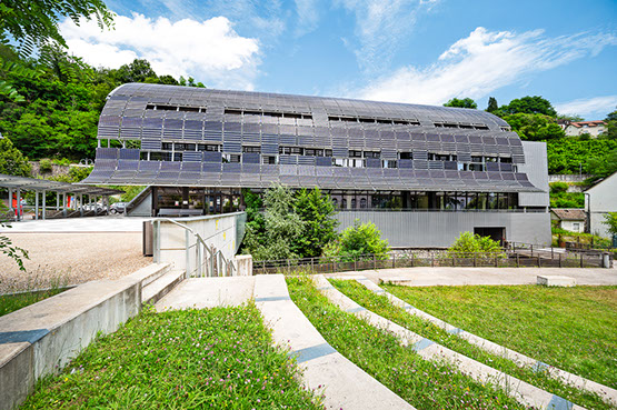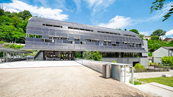 La courbe enveloppante intérieure se projette en extérieur avec une sur-toiture et une double façade recevant des panneaux photovoltaïques, selon un système innovant d'autoconsommation collective de 195 kVA.
