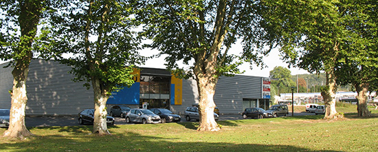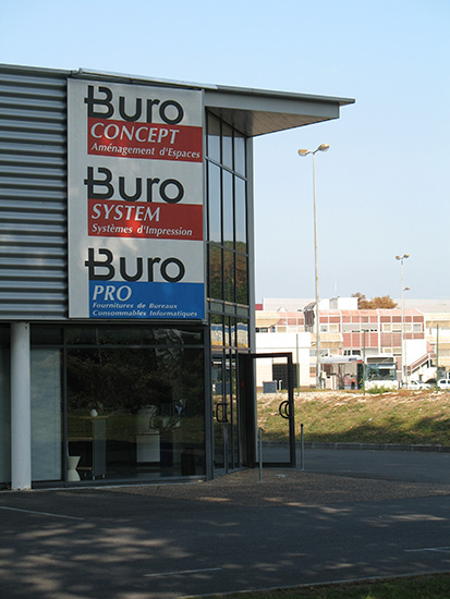Ce bâtiment commercial de fournitures de bureaux est implanté à l’entrée Sud de l’agglomération d’Angoulême, dans une zone en devenir en l’attente de maillages routiers. Le sol marécageux a induit une plateforme renforcée avec des colonnes ballastées pour poser la grande charpente de bois lamellé-collé. Le volume très simple est troué par quelques grands percements seulement : la faille vitrée de l’entrée principale, la découpe d’angle destinée aux clients professionnels, et deux grandes lignes de fenêtres horizontales pour les bureaux des commerciaux. Le bardage horizontal à onde sinusoïdale affirme en douceur l’ancrage du bâtiment dans son site, jouant avec les verticales des platanes bordant le ruisseaux des Eaux-Claires. À l’intérieur du magasin, la forte présence du bois apporte une chaleur agréable.