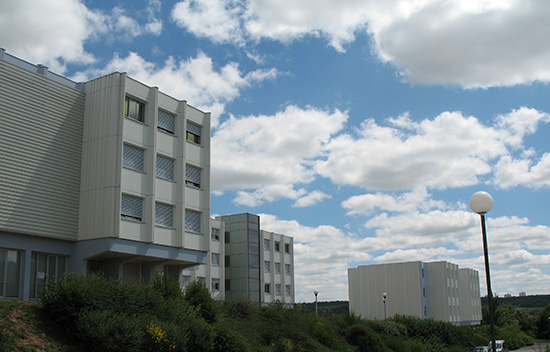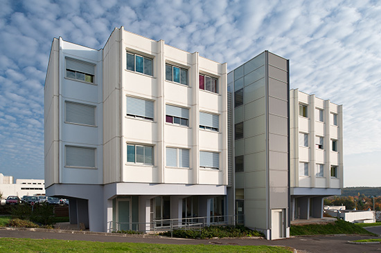 Pour cette restructuration technique de trois bâtiments béton des années 1960 à usage d’internat, nous avons opté pour une mise en valeur de l’architecture originelle : transparence des rez-de-chaussée pour les salles communes, contraste entre les ailes latérales (chambres) et centrales (services). Ainsi, la conception sur pilotis d’origine est amplifiée, de même que la légèreté des étages. La création d’un ascenseur sur le bâtiment central renforce la symétrie et la verticalité des compositions.