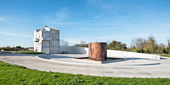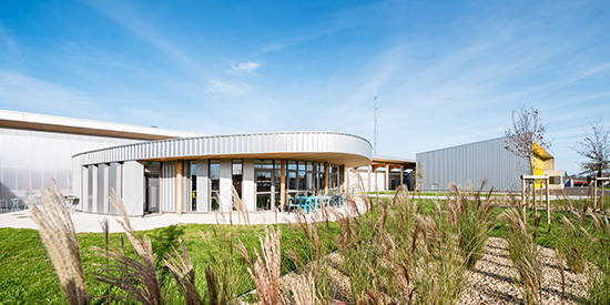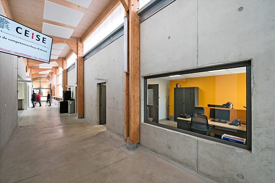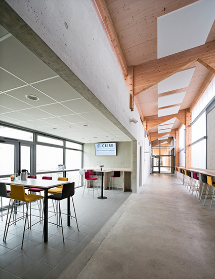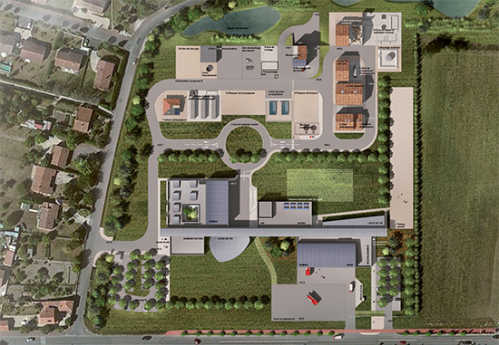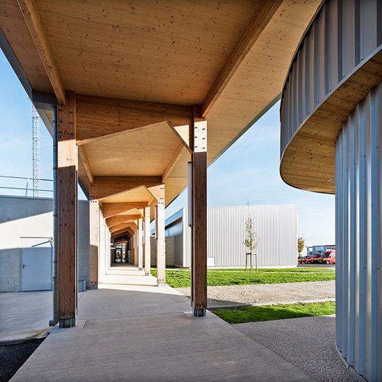 Les bâtiments sont regroupés à l'avant du terrain, le long de l'avenue principale. Ils sont reliés par une galerie de bois marquant les interrelations techniques et fonctionnelles, et formant un signal d'envergure à l'échelle du site.