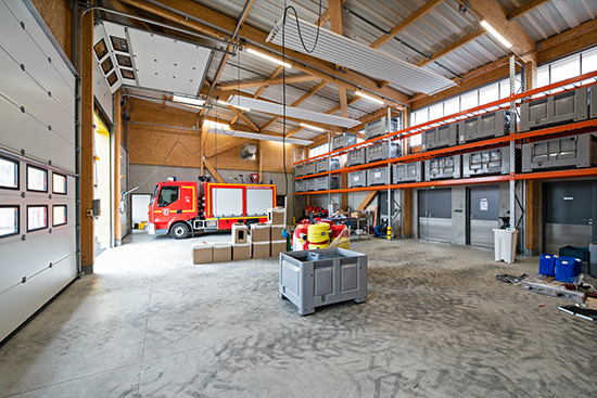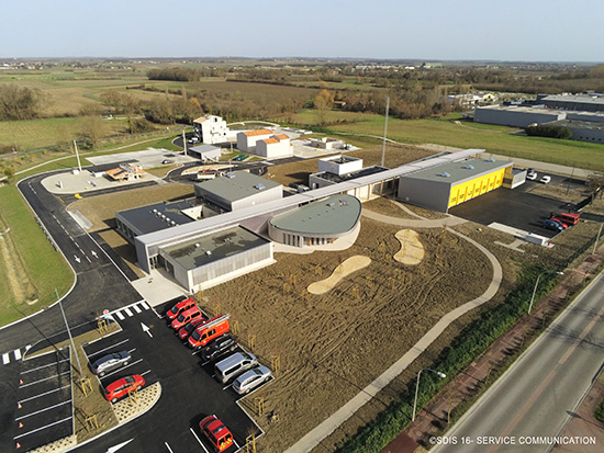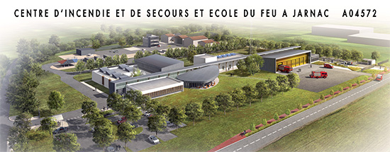 construction du centre de secours de Jarnac et de l'Ecole départementale du feu, avec plateaux de feux d'alcools