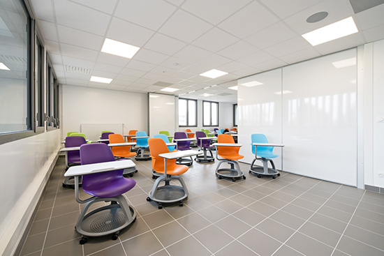 De part et d'autre de cette galerie, chaque bâtiment se déploie selon ses fonctionnalités propres (bureaux, cours, foyers, exercices, remises, ...) avec des écritures très sobres utilisant le béton brut et l'aluminium.