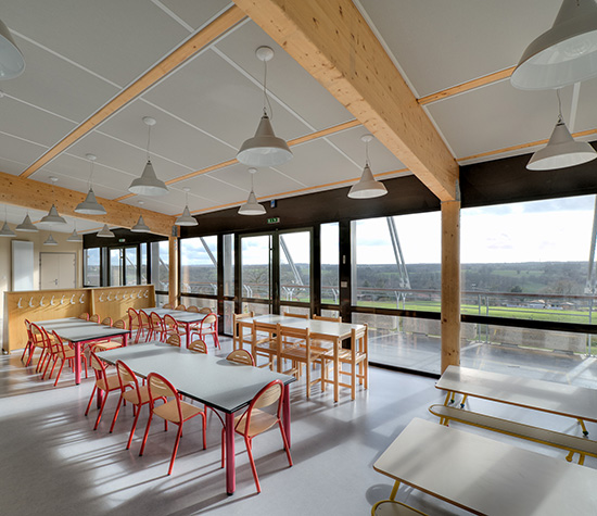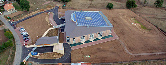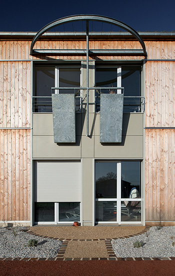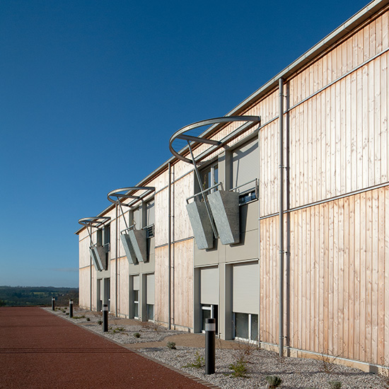 insertion paysagère, ossatures et charpentes bois, e.c.s. solaire, atrium - jardin intérieur, chaufferie bois, production électrique photovoltaïque de 700 m2