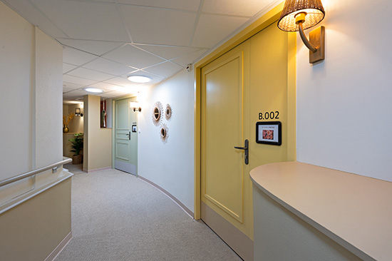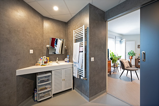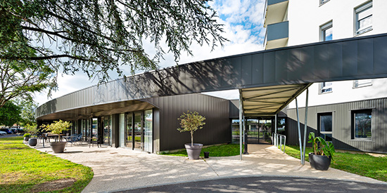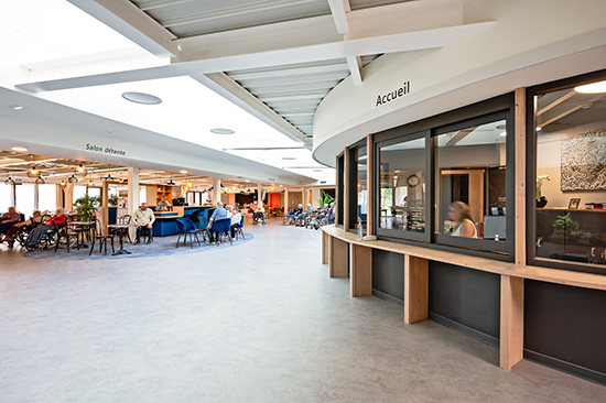 Le projet renforce cette ambiance résidentielle, avec un socle commun démultiplié: les grandes salles de restauration et d'animation forment un tout continu avec un hall généreux réunissant les deux ailes, avec de larges ouvertures sur le parc.
