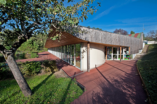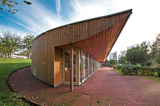 Vu des tours de logements voisines, c’est un piano rayé de rouge et de vert. Vu de l’intérieur, c’est un lieu très particulier où le bois dominant communique sa chaleur aux ambiances colorées pour les tout-petits.