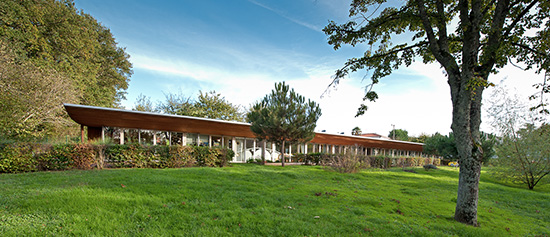 Vu du haut du terrain dans lequel il s’encastre, c’est un enroulement de courbes.
