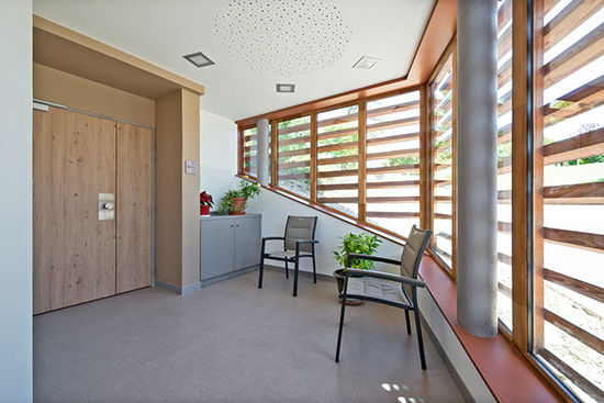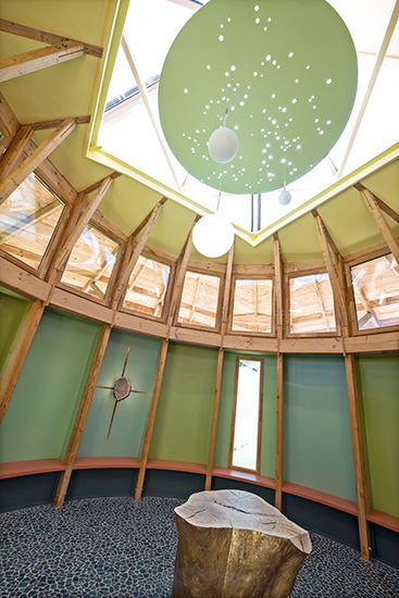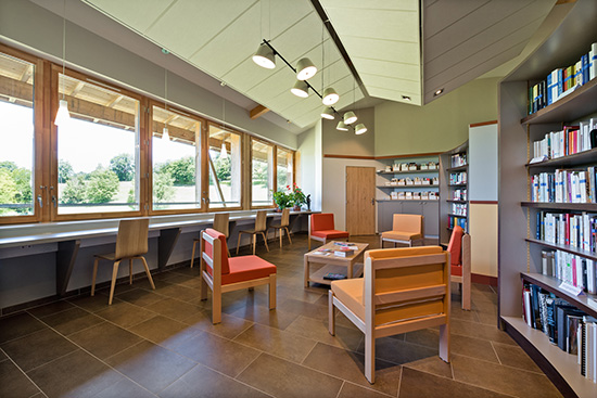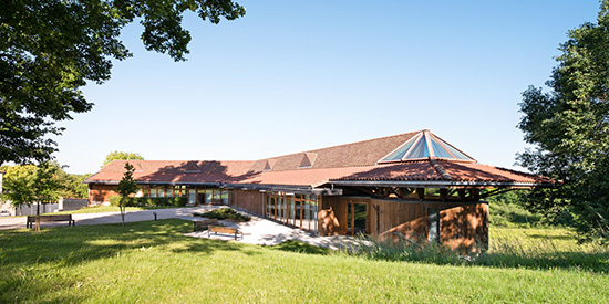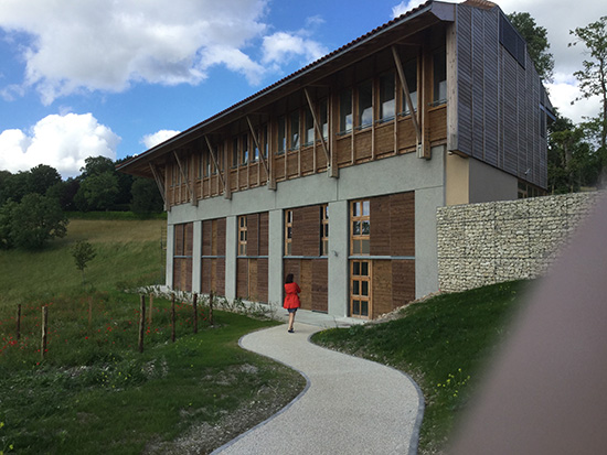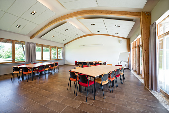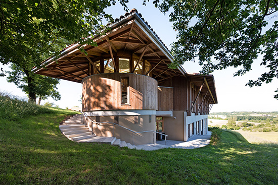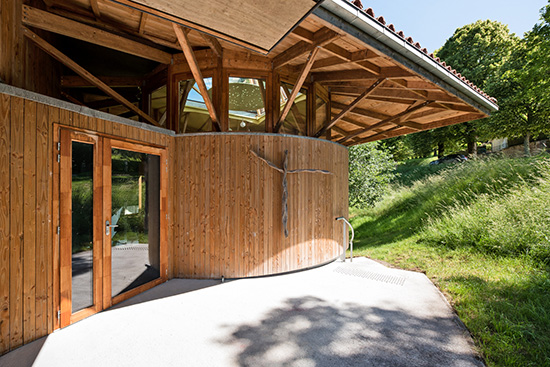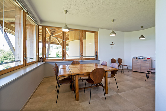 Sur un socle de béton ancré dans la pente où les chambres ouvrent sur le paysage, le niveau supérieur entièrement en bois accueille toutes les activités communes: repas, réunions, bibliothèque. L'oratoire circulaire, en proue du bâtiment, est un signal d'accueil aux visiteurs. Le toit mixte en tuiles plates et courbes réinterprète l'architecture locale.