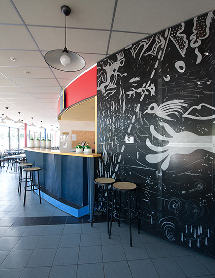 Cette dichotomie trouve son articulation dans l’ « œuf de distribution » qui, au cœur du bâtiment, mélange systèmes de self et de postes à thèmes pour une rencontre conviviale entre étudiants et personnels.