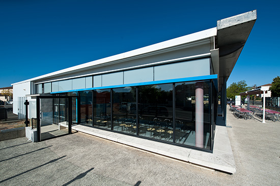 Face à l’IUT, le restaurant universitaire de Sillac est un objet isolé sur l’espace public, comme une balise blanche dans un quartier pavillonnaire de faubourg.