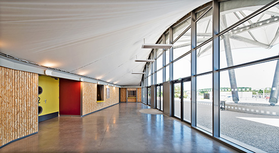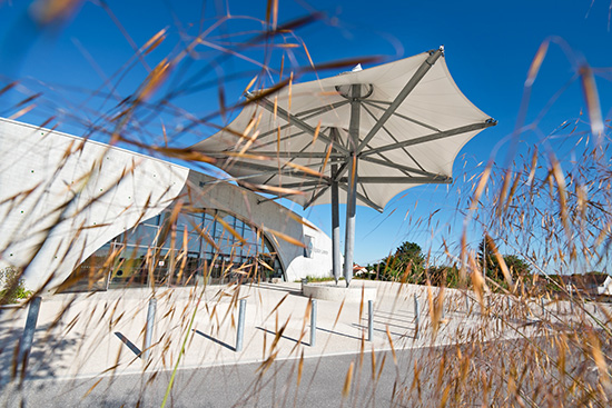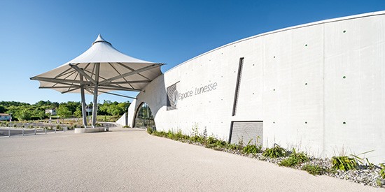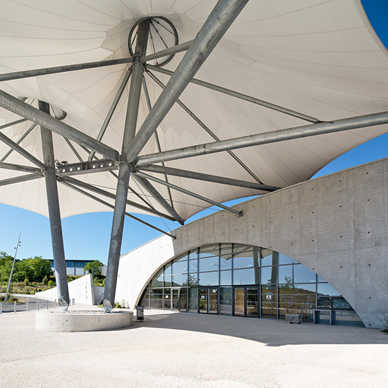 En contrepoint, la légèreté d'une toile tendue signalera le nouveau Lunesse de très loin, y compris la nuit par sa mise en lumière. Cette toile formera un auvent ample et efficace tout en permettant une ventilation ascendante intéressante par forte chaleur. Cette technique éprouvée et pérenne forme un tout avec les "falaises" auxquelles la toile s'arrime. Elle sera un point de repère immanquable entre le lycée et le supermarché.